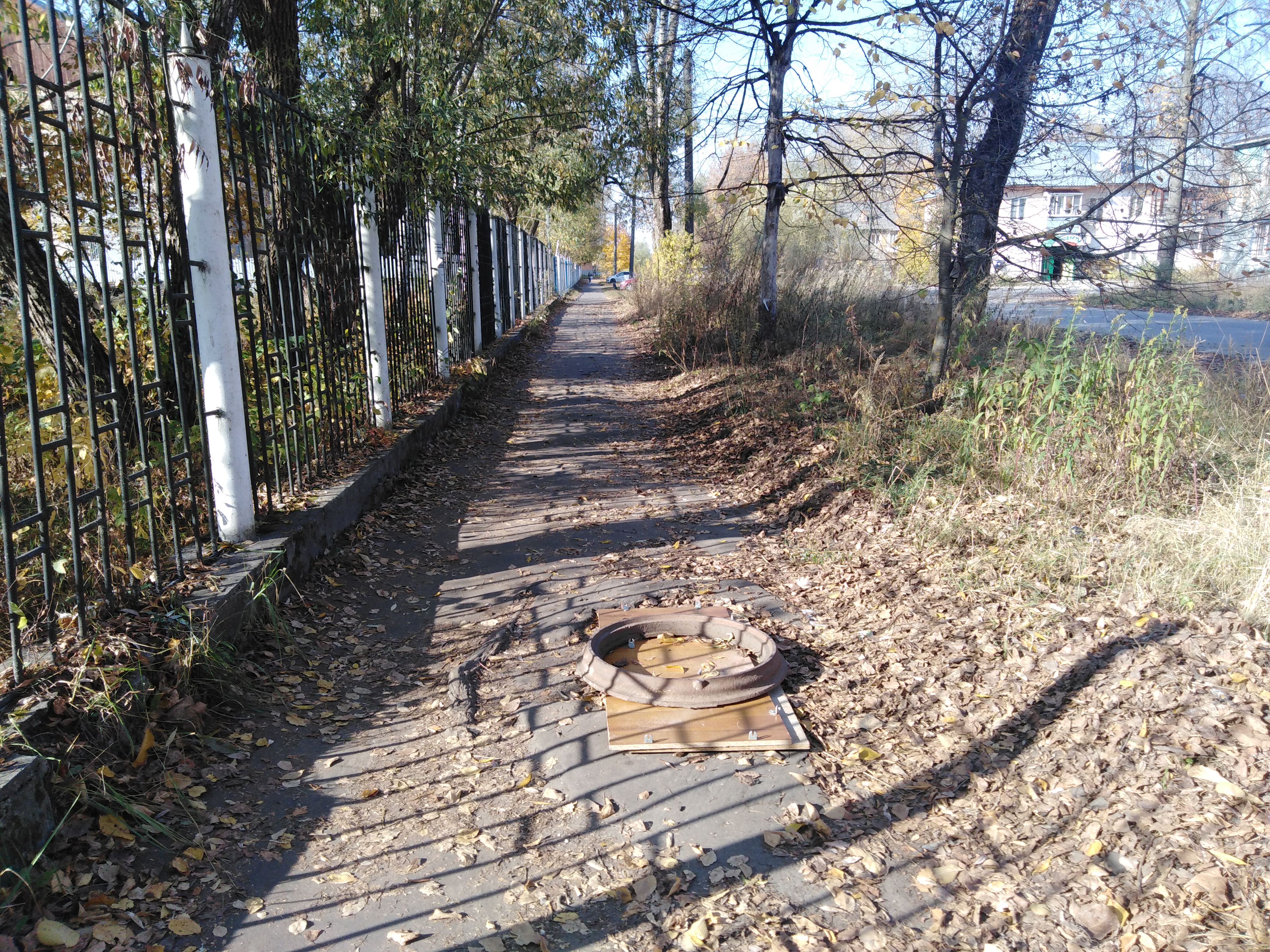 На этой неделе ситуация несколько изменилась. На люке появилась… Нет не крышка, а фанерка, прижатая сверху железным кольцом (смотрите фото).