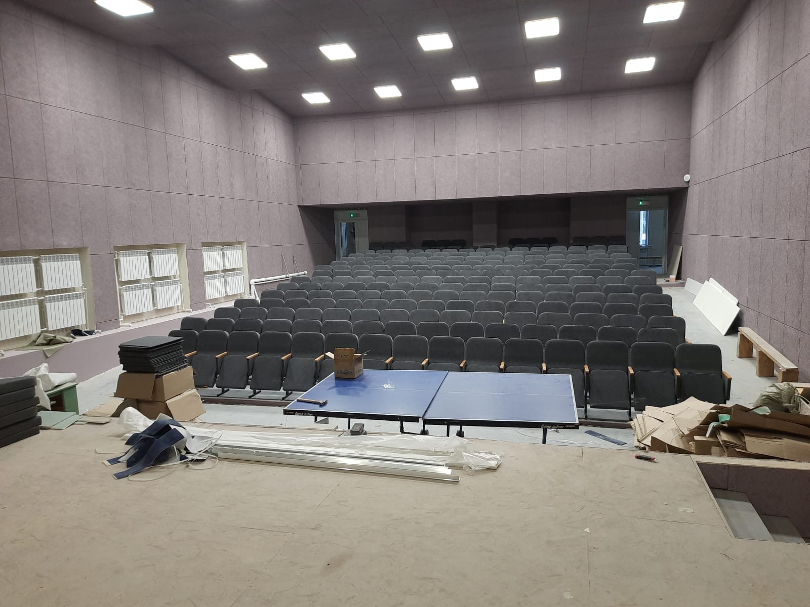 Завершена покраска стен танцевального зала, которая придает яркую и насыщенную атмосферу помещению. Ведется сборка и установка кресел в киноконцертном зале. А также ведется укладка мармолеума (натуральный вид линолеума, который безопасен для аллергиков и детей) на сценах танцевального, киноконцертного зала и в гримерках.