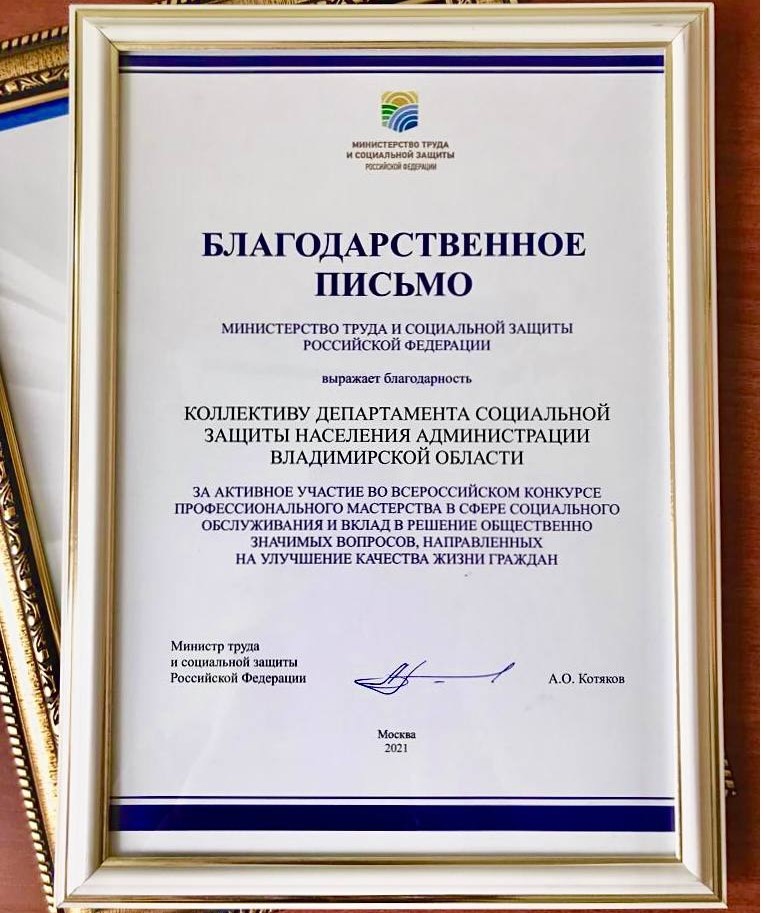 Благодарственным письмом от Министра труда и социальной защиты Российской Федерации Антона Котякова отмечен Департамент социальной защиты населения Владимирской области.
