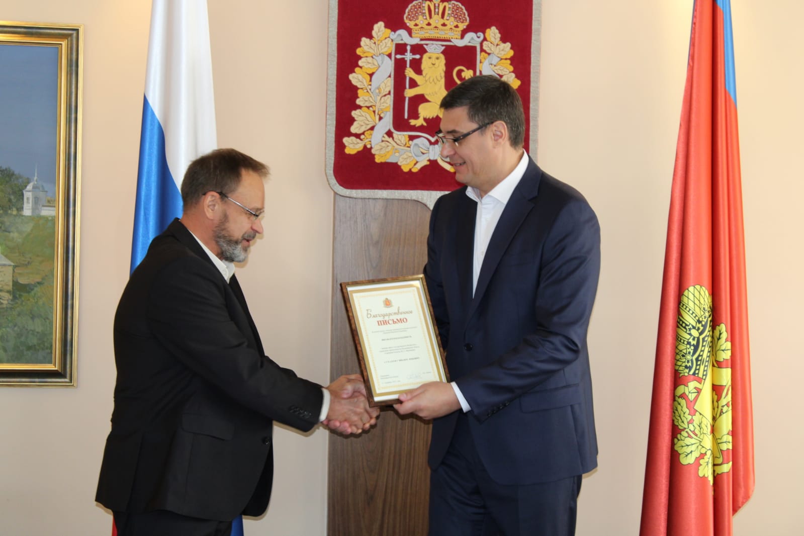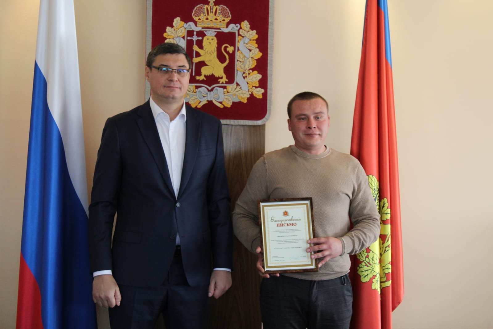 В подкрепление слов он вручил Благодарственные письма администрации Владимирской области Михаилу Суханову, Татьяне Дзус, Максиму Русакову и Алексею Андрееву. Благодарственными письмами администрации города Докучаевска отмечены Дмитрий Смирнов, Сергей Тимкин, Марат Хусаинов, Владимир Петухов и Евгений Радченко.
