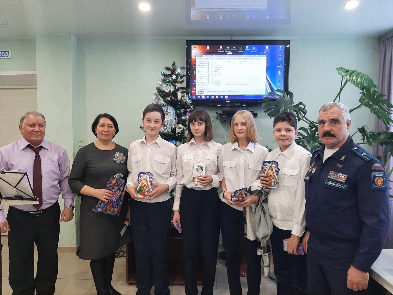 Учащиеся школы No 7 задавали разные новогодние вопросы и прочитали напутственное новогоднее стихотворение присутствующим гостям. Малолетняя узница концлагеря ГЕТО Р.С.Пузь представила собственное стихотворение «Снова страшное слово война», адресованное солдатам Донбасса. Удивительно трогательное и душевное прочтение авторских стихов и песен, размышления о мире, дружбе и любви прозвучали в исполнении Н.В.Царева. Он всех затронул за живое и заслужил аплодисменты всех присутствовавших на мероприятии.