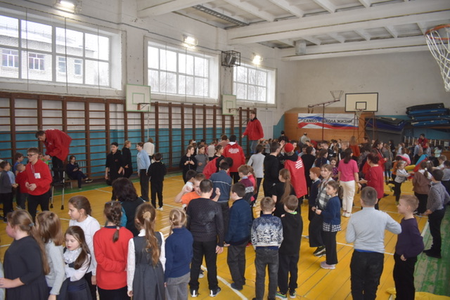 Далее в спортивном зале школы была организована веселая спортивная ярмарка для детей младшего звена. Участвуя в конкурсах, мальчишки и девчонки зарабатывали жетоны, а после меняли их на сладости в импровизированном магазине.