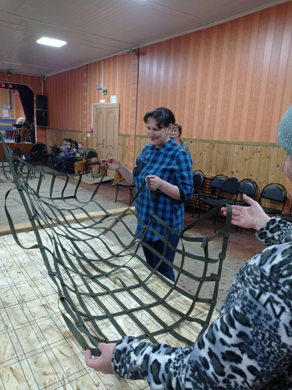 Работают инициативные жители в помещении местного дома культуры. На расчерченные столы определенного размера волонтеры по определенной схеме выкладывают длинные чёрные ленты — парашютные стропы. Прочные полоски ткани активисты умело сплетают в сети. Прищепками закрепляют края, чтобы ровно соединить каждую клеточку тактических носилок. Легкая, компактная конструкция имеет широкое применение: с помощью носилок можно переносить раненых, боеприпасы, можно использовать как гамак, маскировочную сеть или как лестницу — и это далеко не все возможности простого с виду устройства.