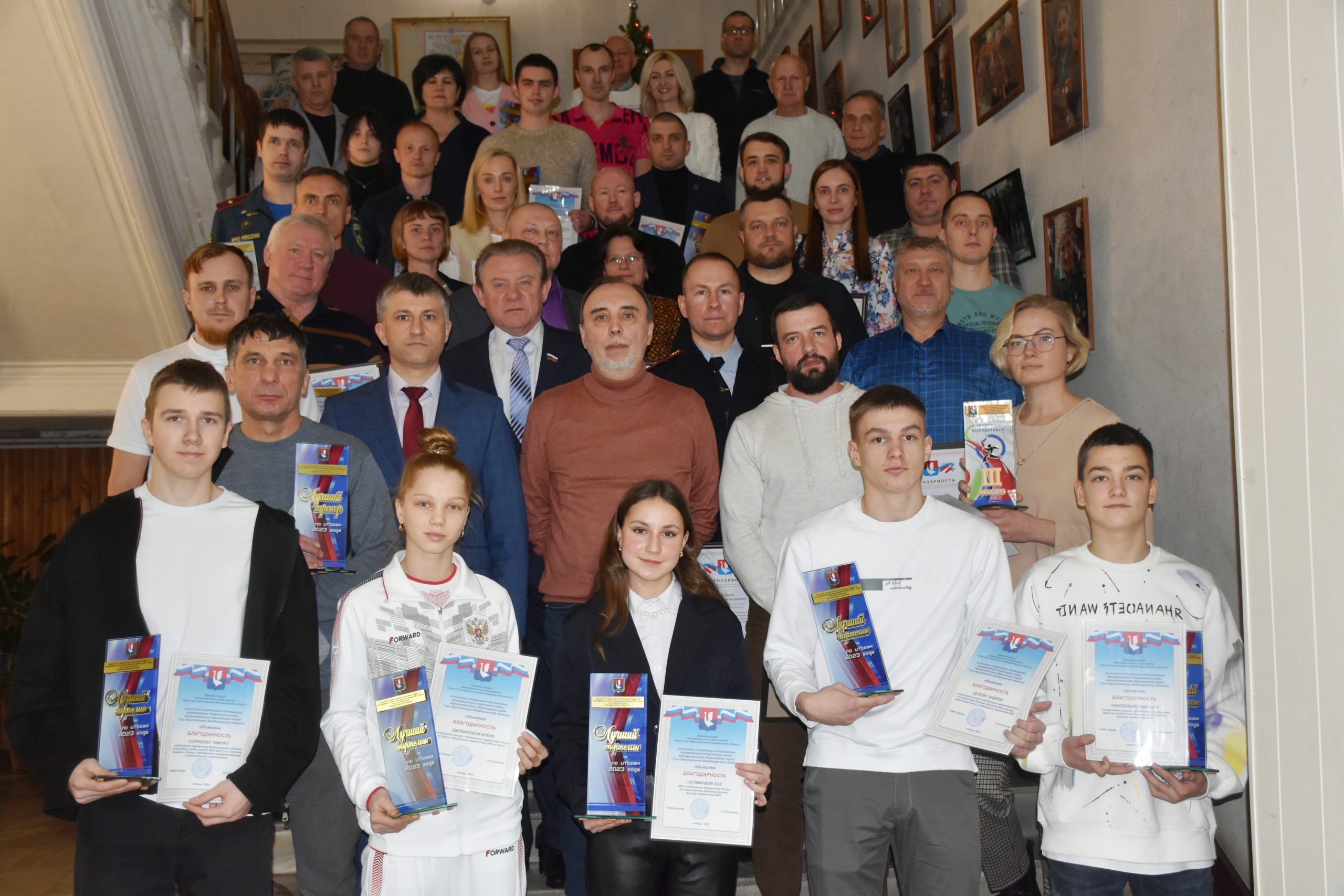 Отдельный блок торжественного мероприятия, посвященного итогам спортивного сезона 2023 года, был отведен чествованию представителей команд трудовых коллективов, руководителей предприятий, поддерживающих развитие спорта в Гусь-Хрустальном и стимулирующих своих сотрудников к занятиям спортом, по итогам круглогодичной спартакиады.
