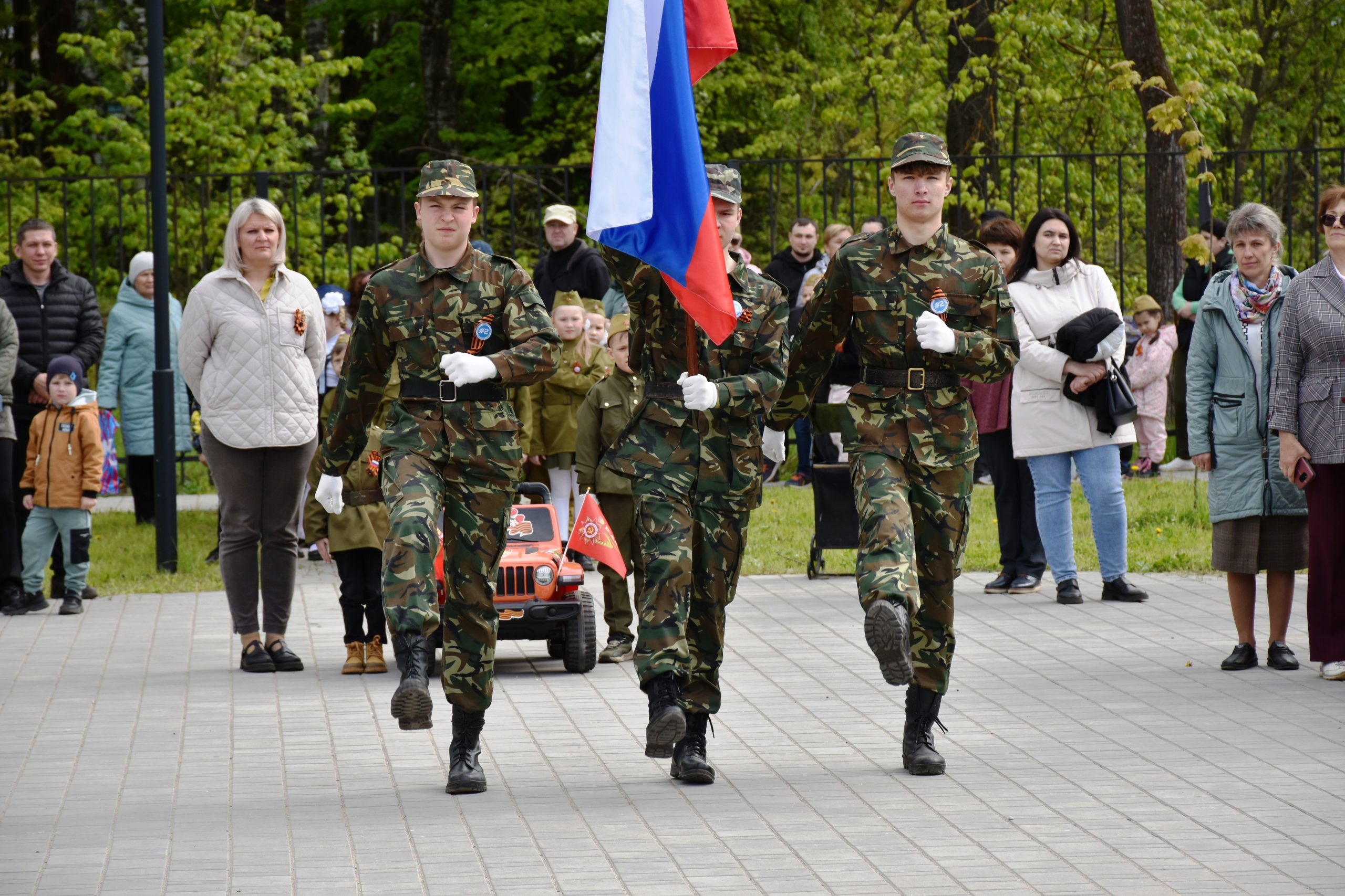 Право внести Флаг Российской Федерации было предоставлено победителям муниципальной военно-спортивной игры «Зарница 2.0.» в старшей возрастной группе, ученикам школы № 2 Ивану Егорову, Ивану Лукьянову и Константину Сараеву.
