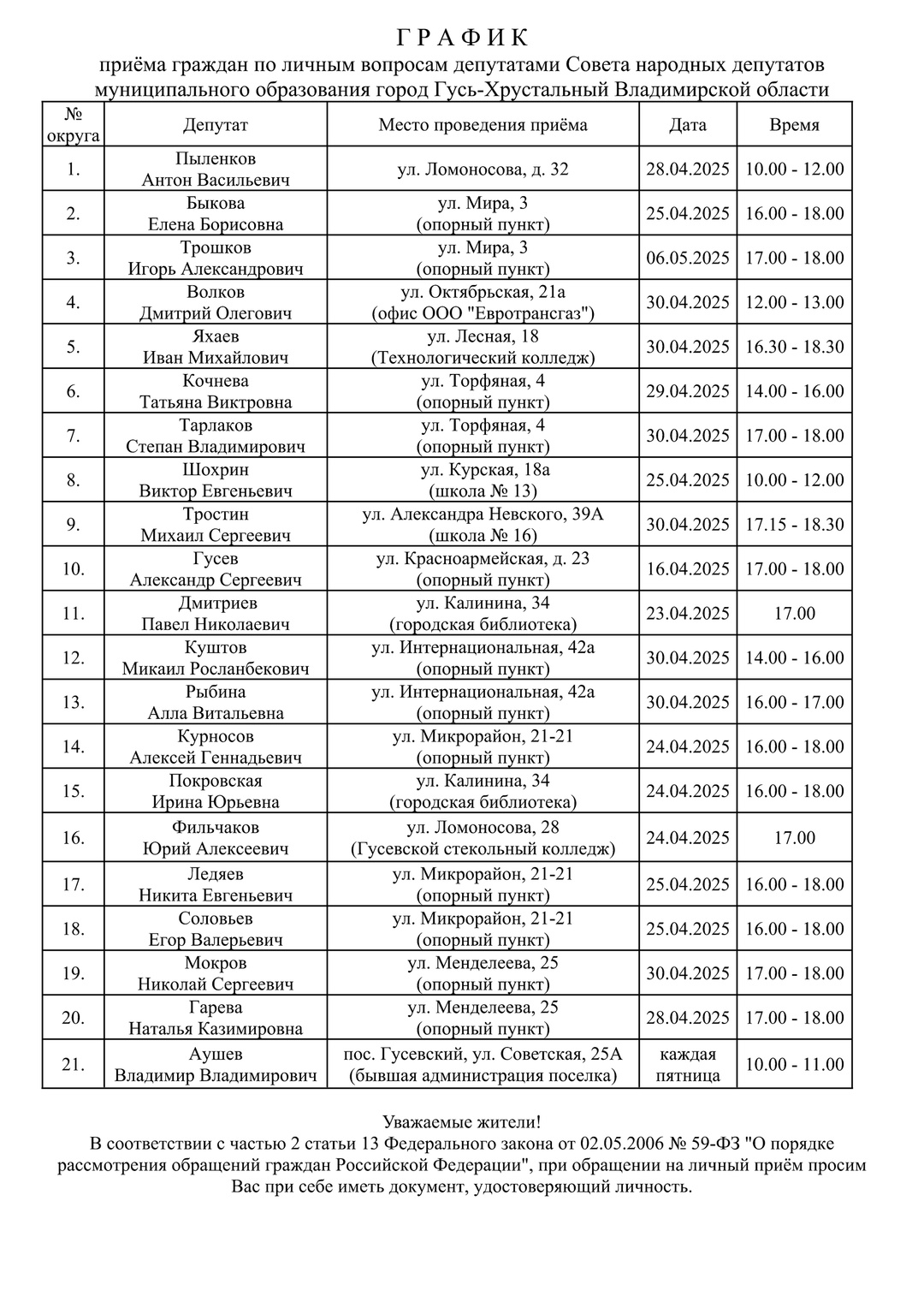 ДомойОрганизацииГород, властьГрафик приема граждан по личным вопросам депутатами Совета народных депутатов График приема граждан по личным вопросам депутатами Совета народных депутатов 07.04.2025 0 2545 Поделиться ссылкой: Оцените этот материал Информационная продукция для людей, достигших возраста шестнадцати лет (16+) Предыдущая статьяЧтобы помнили…Следующая статья«… В ней не дешёвая интрига, а славная история живёт» ПОХОЖИЕ МАТЕРИАЛЫ Город, власть График приема граждан 11.09.2025 Город, власть График приема граждан по личным вопросам депутатами СНД 14.07.2025 ОСТАВЬТЕ ОТВЕТ Отменить ответ Комментарий: Пожалуйста, введите ваш комментарий! Имя:* пожалуйста, введите ваше имя здесь Электронная почта:* Вы ввели неверный адрес электронной почты! пожалуйста, введите свой адрес электронной почты здесь Веб-Сайт: сохраните мое имя, адрес электронной почты и веб-сайт в этом браузере для следующего комментария. Δ Этот сайт использует Akismet для борьбы со спамом. Узнайте, как обрабатываются ваши данные комментариев.