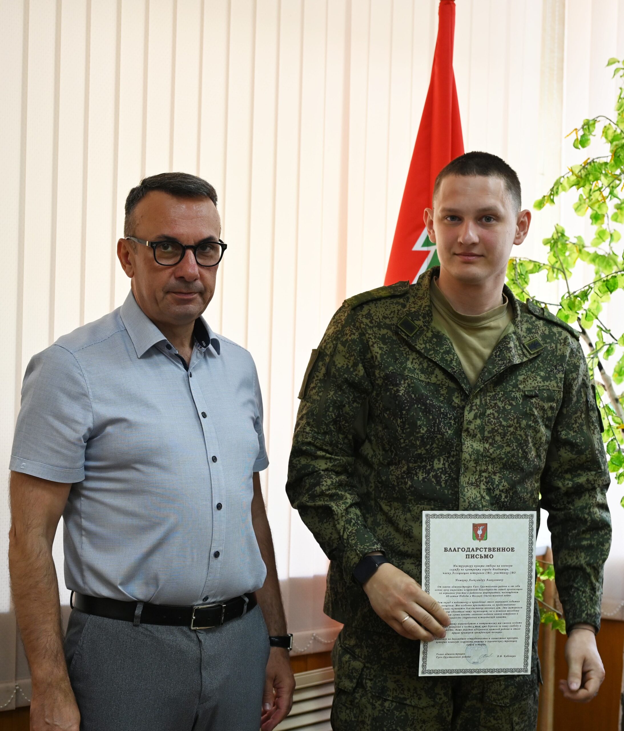 Благодарственное письмо за активное участие в районном мероприятии, посвящённом 80-летию Победы в Великой Отечественной войне глава администрации Гусь-Хрустального района Алексей Кабенкин вручил инструктору пункта отбора на военную службу по контракту города Владимира, члену Ассоциации ветеранов СВО, участнику специальной военной операции Александру Немкову.