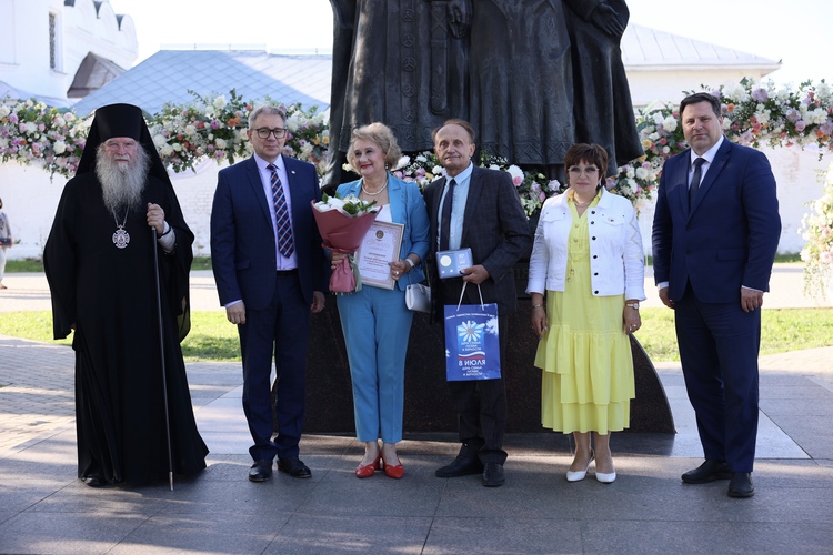 Возле памятника Петру и Февронии состоялось главное событие праздничной программы — церемония чествования семей, проживших в браке долгие годы. 20 семейных пар были награждены медалями «За любовь и верность».
