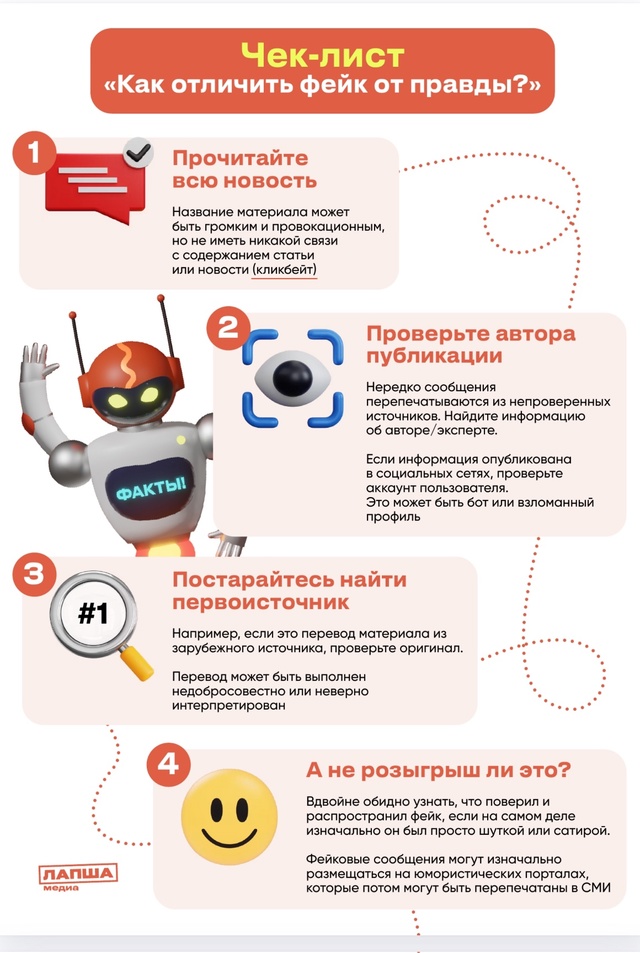 Друзья, предлагаем ознакомиться с чек-листом для проверки информации на достоверность «Как отличить фейк от правды?» от АНО «Диалог Регионы»