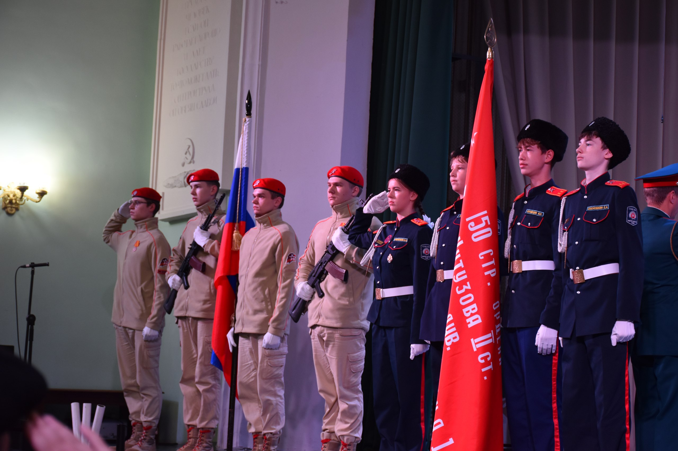 Под патриотическую музыку Государственный флаг российской Федерации и копию Знамени Победы внесли знаменные группы юнармейского военно-инженерного отряда «Патриот» имени Героя Советского Союза Карбышева, центра дополнительного образования «Исток» и кадетов школы №10.