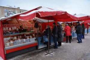 Ярмарка, приуроченная к Новогодним праздникам, начала свою работу в Гусь-Хрустальном 22 декабря. Праздничная торговля развернулась в домиках Шале, и на противоположной стороне в красных шатрах.