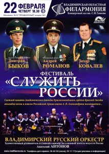 22 февраля во Владимирской области стартует культурный проект «Служить России». Он включает в себя четыре концерта, которые будут посвящены светлой памяти артистов Академического дважды Краснознаменного ансамбля песни и пляски Российской армии имени А.В. Александрова.